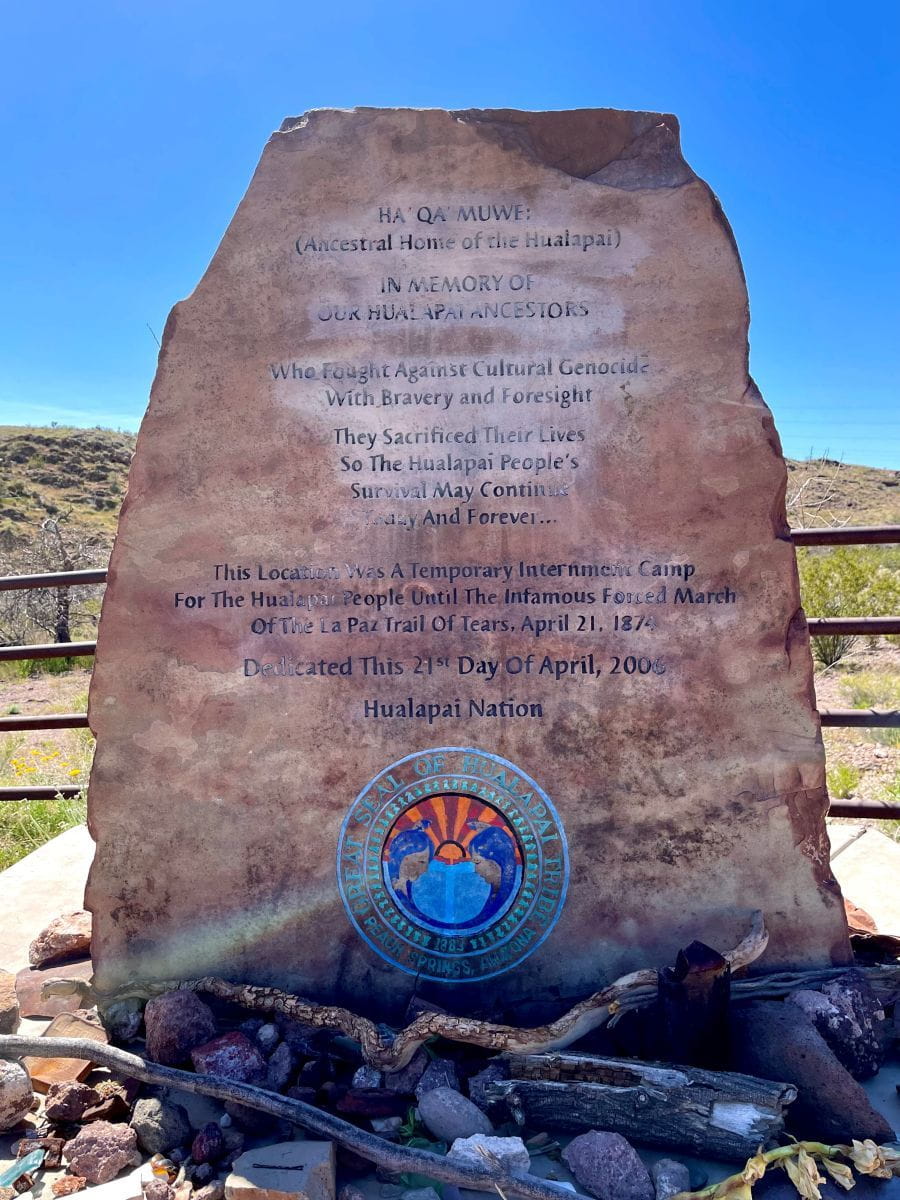 The camp remained active until April 21, 1874, when the Hualapai people were forced out of the internment camp located at Camp Beale Springs. From there, they were forced at gunpoint to march the La Paz Trail of Tears. Thousands of Hualapai people were brutally abused and died. On April 21, 2006, this historical marker was placed in their honor. As we enjoy the many beautiful hiking trails of the Mojave Desert, it is important to remember the significant history of this area.