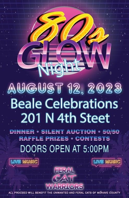 Are you ready to travel back to the most vibrant era and dance the night away to your favorite 80's hits? Then, don't miss Feral Cat Warriors' first annual gala fundraising dinner, "80’s Glow Night", happening on August 12, 2023, at Beale Celebrates in Downtown Kingman.