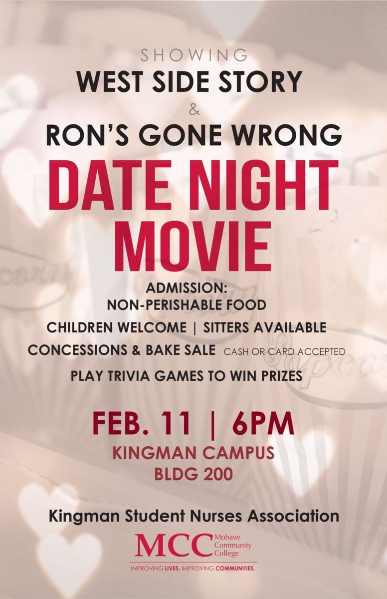 Looking for an inexpensive date idea? Join MCC's Student Nursing Association for a Date Night Movie by watching West Side Story or Ron's Gone Wrong!