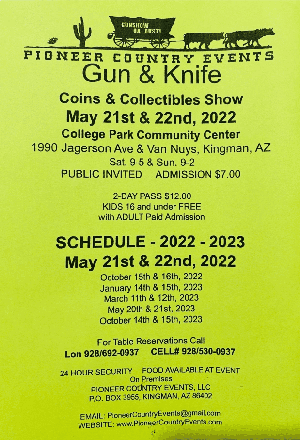 Pioneer Country Events is the oldest gun, knife, coin, collectibles and antique show in Mohave County! They are located at the College Park Community Center, 1990 Jagerson Ave. The facility faces Van Nuys and will hold approx. 100 tables. They provide a friendly atmosphere welcoming dealers in coins, guns, knives, clips, ammo and U.S. or Foreign Military memorabilia and collectibles of all kinds. Admission: $7.00 per person, 2-Day pass $12.00, children 16 & under are free with paid adult admission!