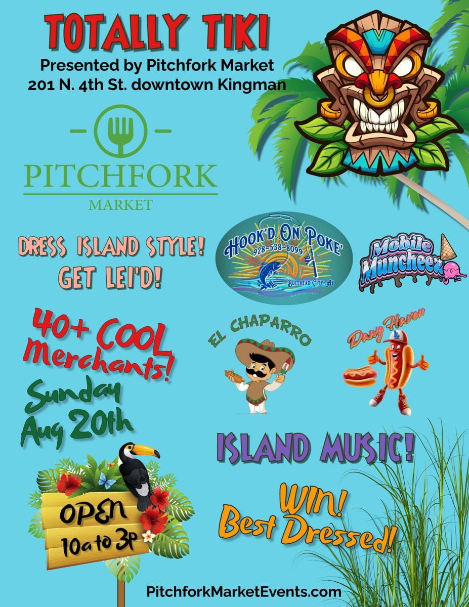ALOHA KINGMAN! Sunday, August 20th is our TOTALLY TIKI market and YOU'RE invited!! Dress island style and you just may win something cool! We have colorful Hawaiian lei's to give out! Shop our 40+ merchants many who will have island and tropical inspired products for sale! Think mango, papaya, coconut bath & body products, unique tiki art pieces, tropical baked goods, crocheted tiki dolls and more!