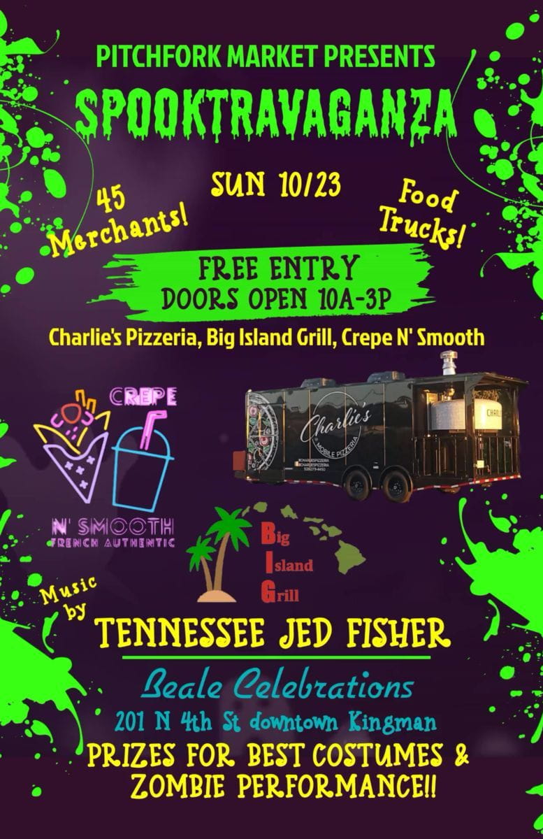 SPOOKTRAVAGANZA! Sun. 10/23 This will be a family friendly event with 45 small business merchants, prizes for best costume and for best zombie performance, music by Tennessee Jed Fisher, Charlie's Pizzeria, Big Island Grill, and Crepe N' Smooth Food Trucks, baked goodies and more! It's starting to cool down, so we are also holding a cold weather clothing & blanket drive. PLEASE kindly donate your new and/or gently used coats, jackets, sweaters, sweatshirts, hoodies, sweatpants, blankets. Let's help keep our Kingman citizens bundled up this winter! Market hours are 10am-3pm. Pitchfork Market is located inside the turquoise Beale Celebrations building in historic downtown Kingman at 201 N. 4th St. Free to the public. We can't wait to see you!
