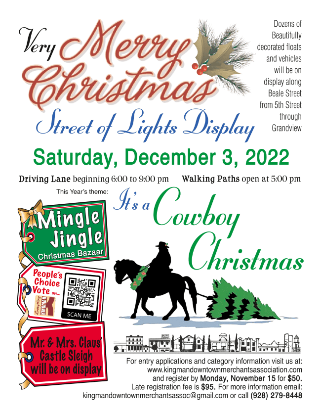 Like many other traditions transformed by the pandemic, the Kingman Downtown Merchants Association’s annual parade turned upside down last year and the recreation took hold to continue in the same fashion this year. Lights will feature a stationary display of floats and vehicles lined up on Beale Street in our Historic Downtown from 5th St to Grandview.